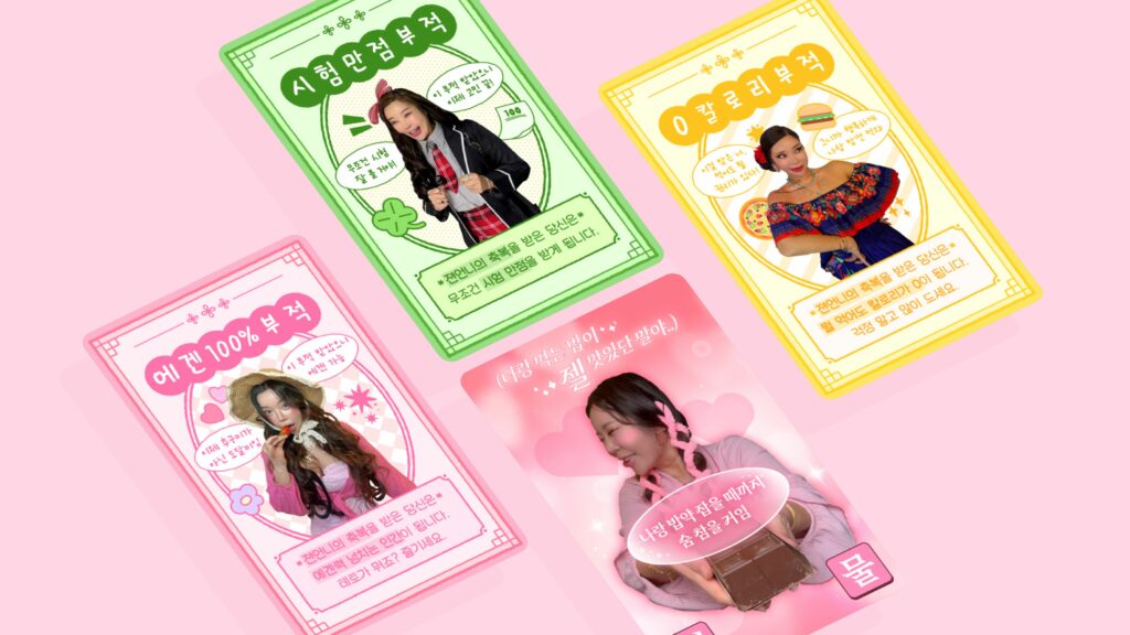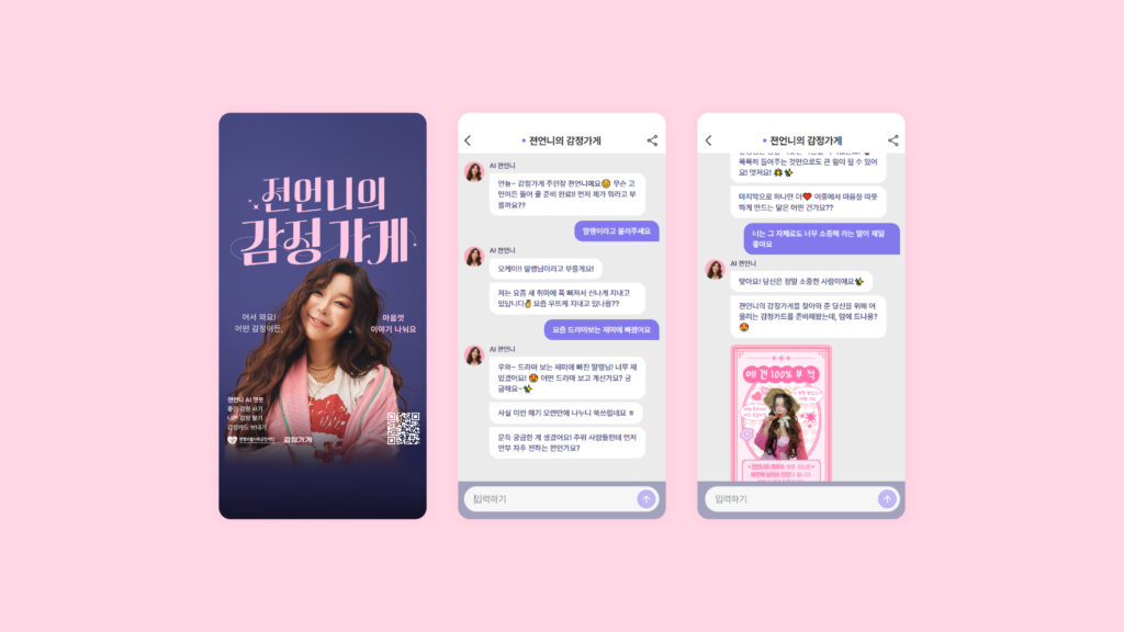이때 10대 타깃에게 친숙한 크리에이터의 캐릭터와 팬덤을 적극 활용하여 자발적인 유입을 유도했습니다. 젼언니의 말투와 성격을 AI 챗봇에 반영해 사용자와 대화를 나누는 인터랙티브 콘텐츠를 제작했으며, 감정을 분석해 ‘공감’, ‘칭찬’, ‘응원’ 등으로 구성된 감정카드를 제공하는 방식으로 청소년의 감정 표현을 유도했습니다.